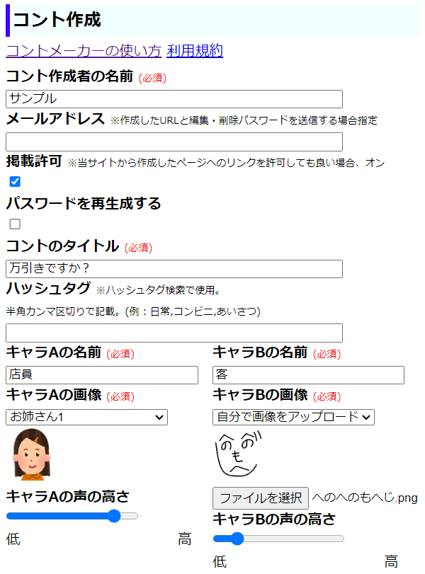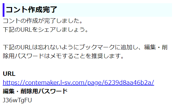 - コントの作成が完了します。編集・削除用パスワードと作成したURLはメモしておきましょう。