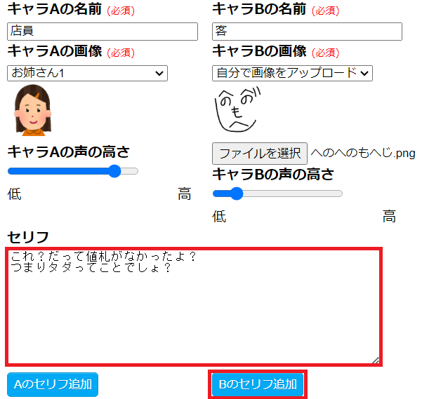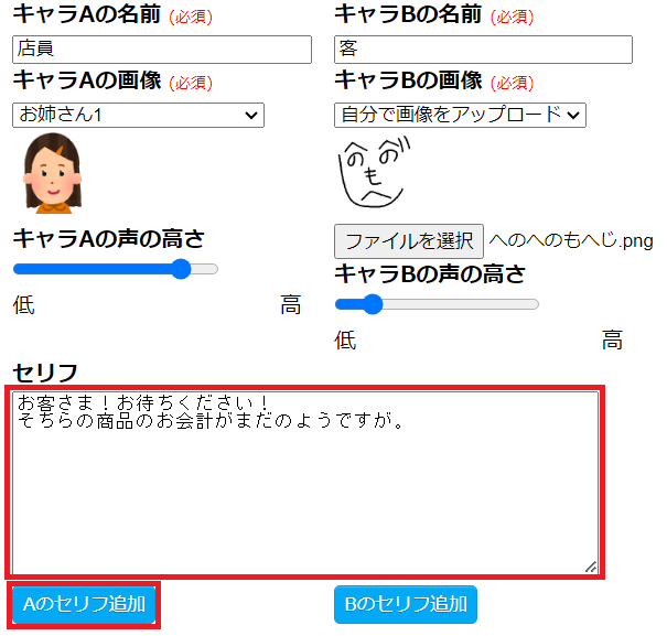 キャラの画像は、「自分で画像をアップロード」を選択すると、自分で画像をアップロードすることも可能です。 - セリフを入力し、発言するキャラの「セリフ追加」ボタンを押下します。