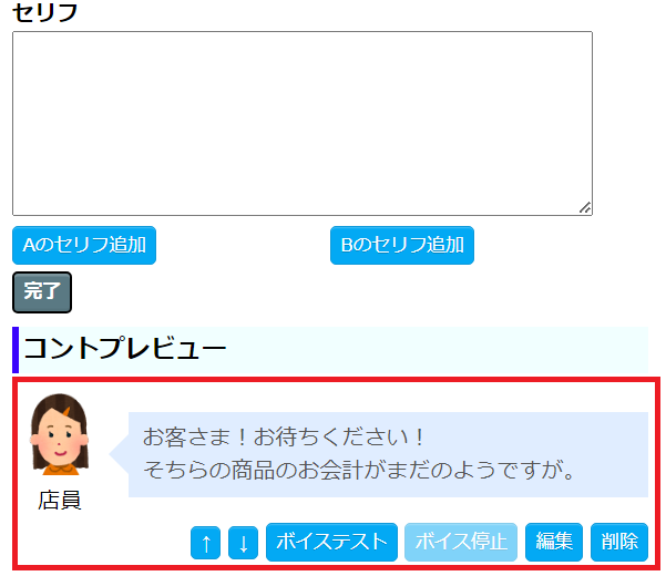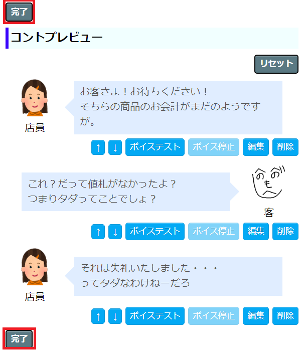 - 上記の要領で「セリフ追加」を繰り返し、作成が完了したら、「完了」ボタンを押下します。